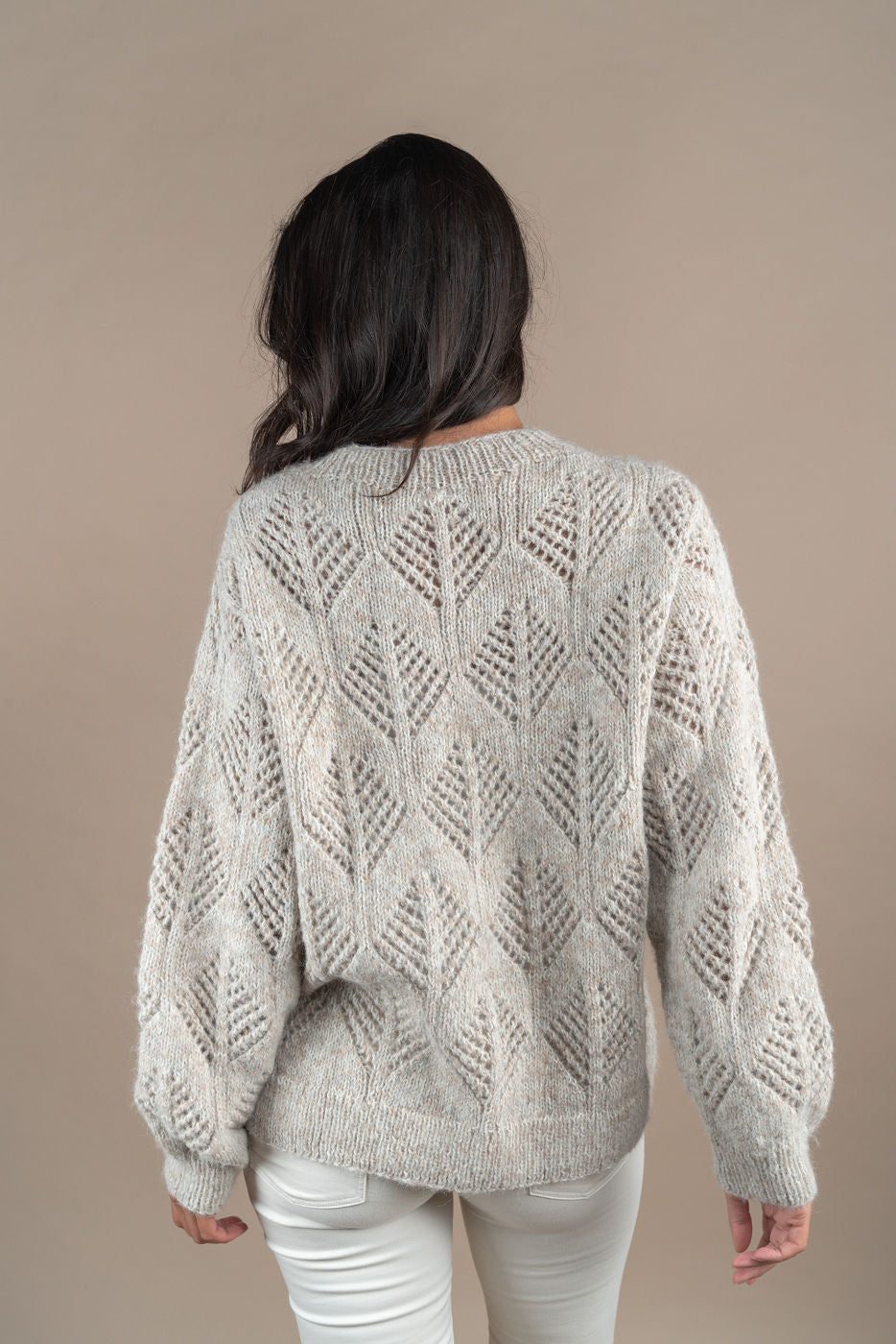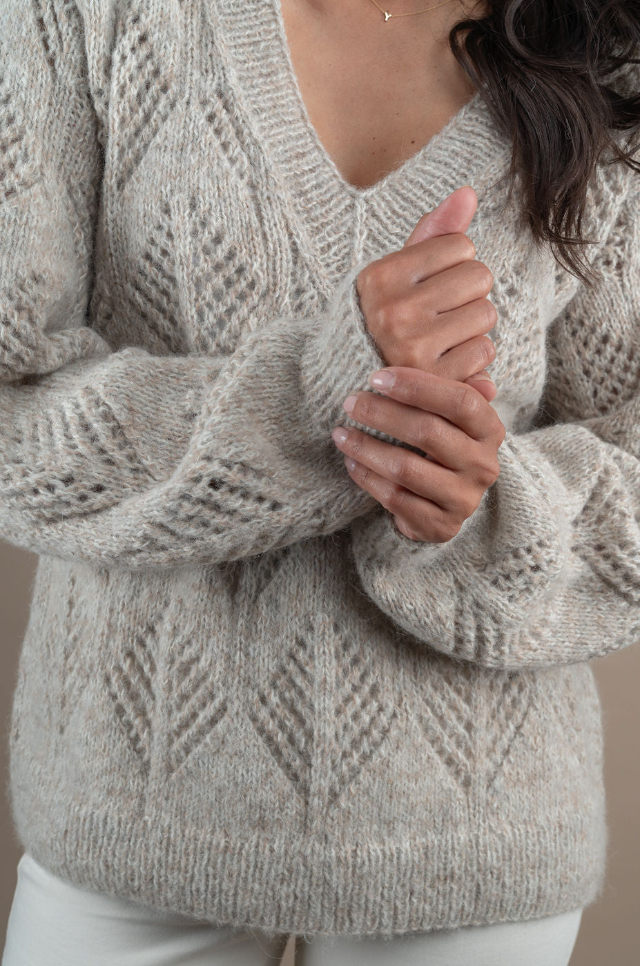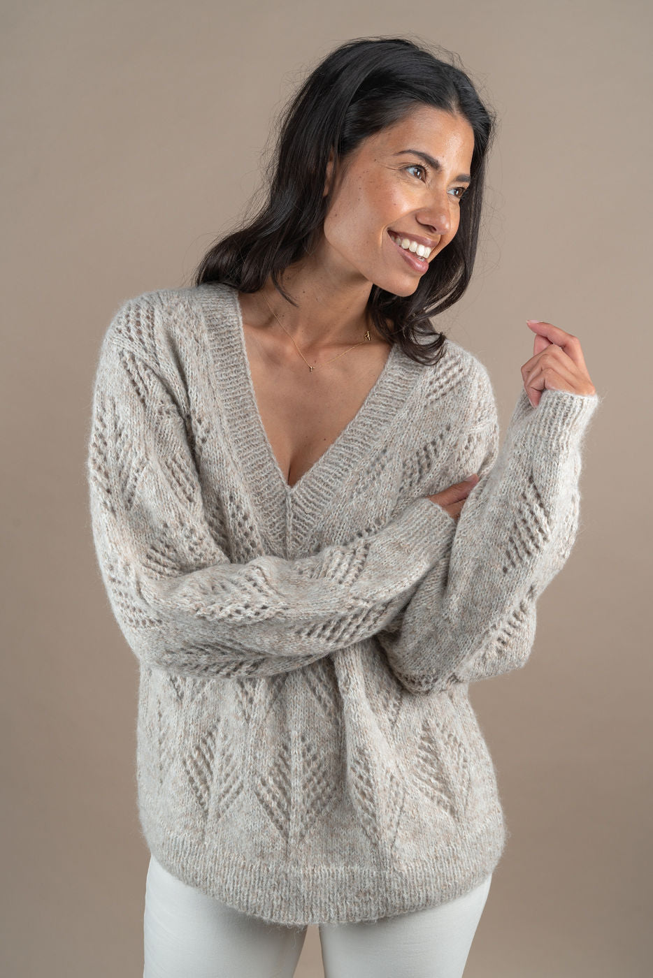 De Ada sweater is een v-pull in 100% baby alpaca. Ada is met de hand gebreid in een mooi patroon en een mélange van puur natuurlijk wit, grijs en zandkleur. Deze v-pull heeft een zeer vrouwelijke elegantie. Model is 178 cm en draagt een L.