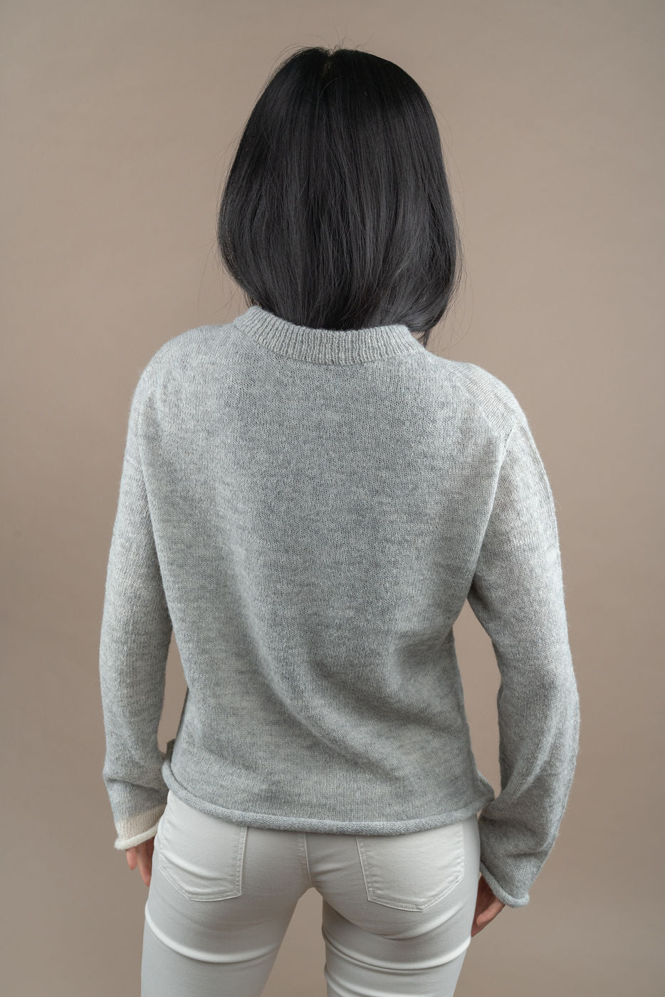 Amalia is een heel fijn, superzacht pulletje met ronde hals in 100% baby alpaca. Het komt tot op de heupen en heeft opgerolde randen aan de mouwen en boord onderaan. Klein detail : de linker manchet is in een bijpassende kleur. Het model is 168 cm en draagt een M.