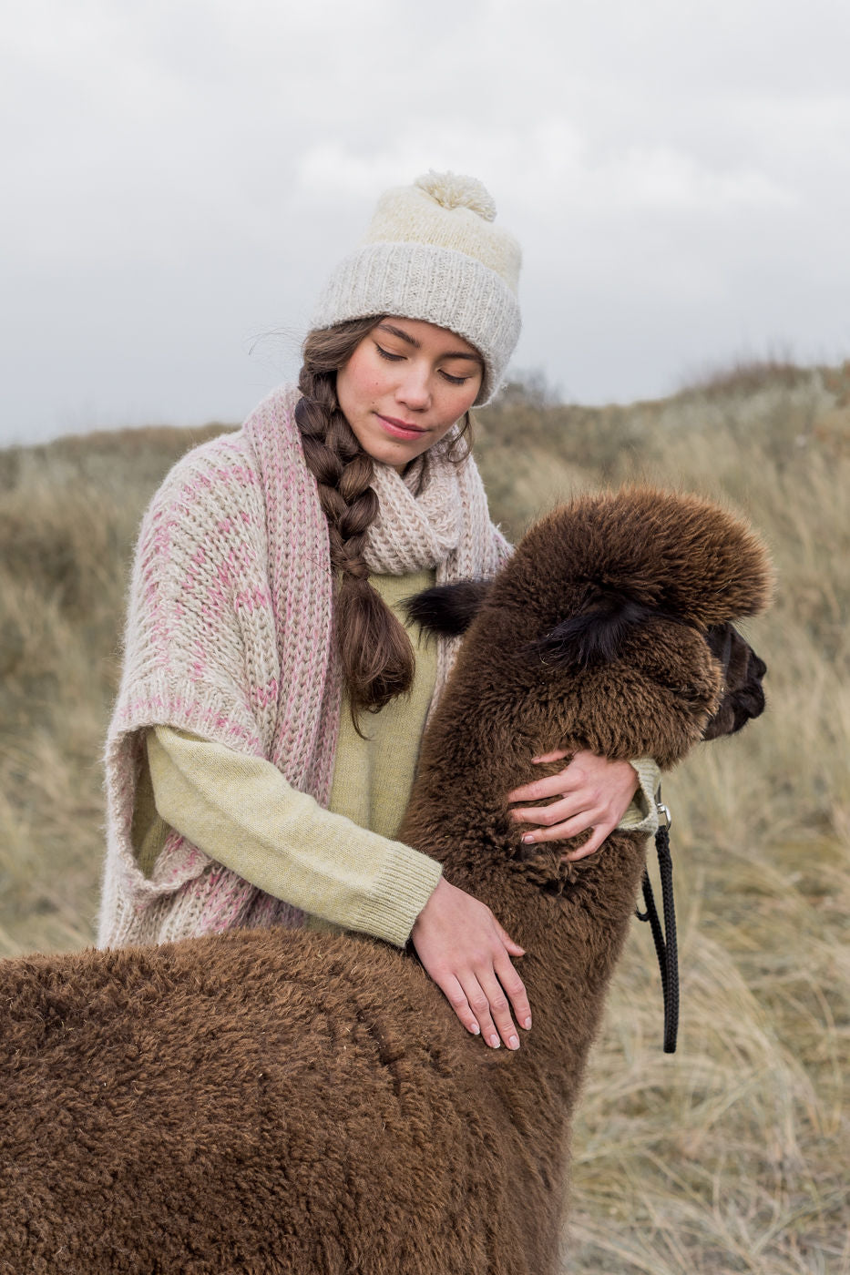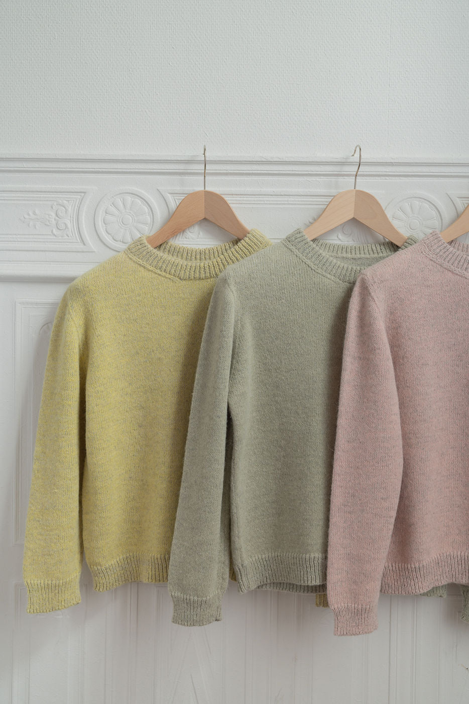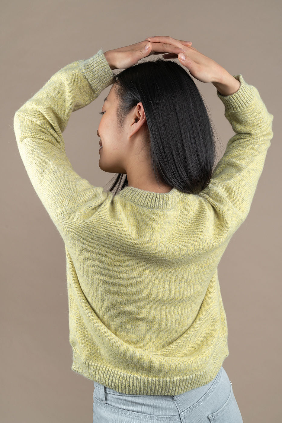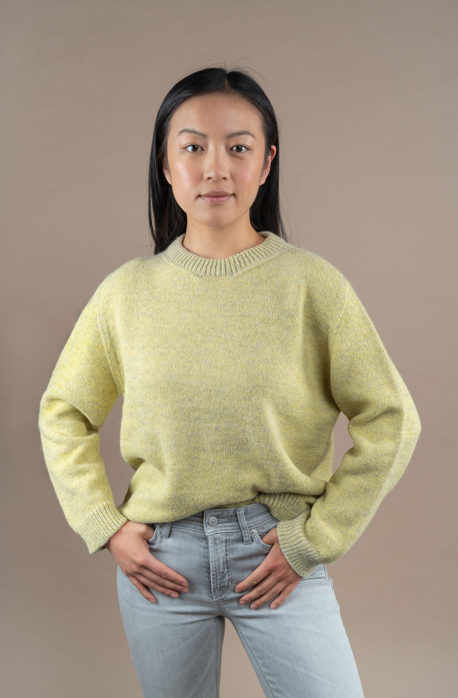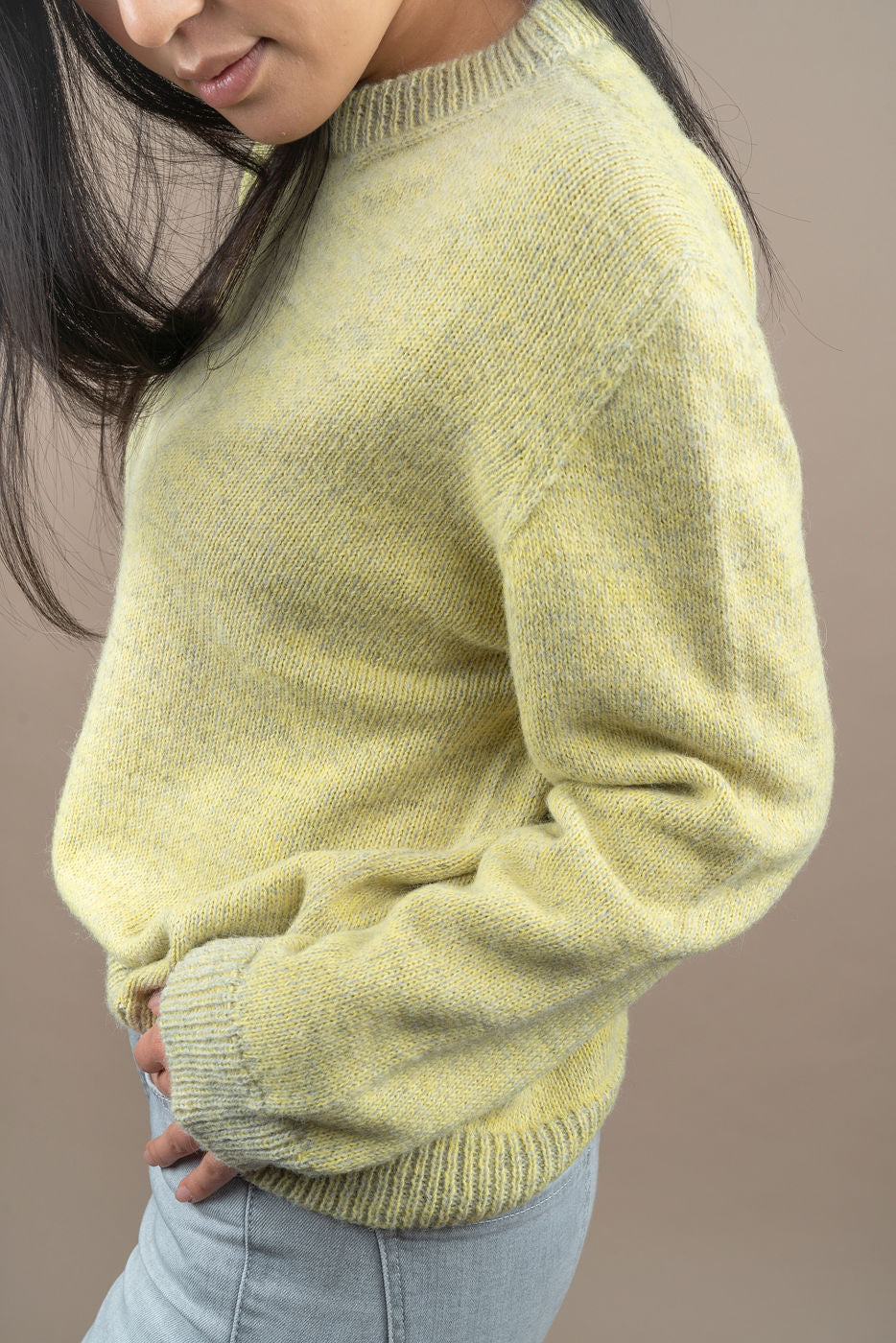 Amaryllis is een fijn pulletje met een ronde hals in 100% baby alpaca, het valt tot op de heupen en heeft een rib aan de manchetten en onderaan de pull. Deze pull werd met de hand gebreid in een mélange van warm geel en licht grijs. Het model is 168 cm en draagt een M.