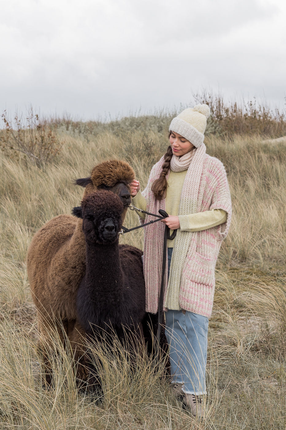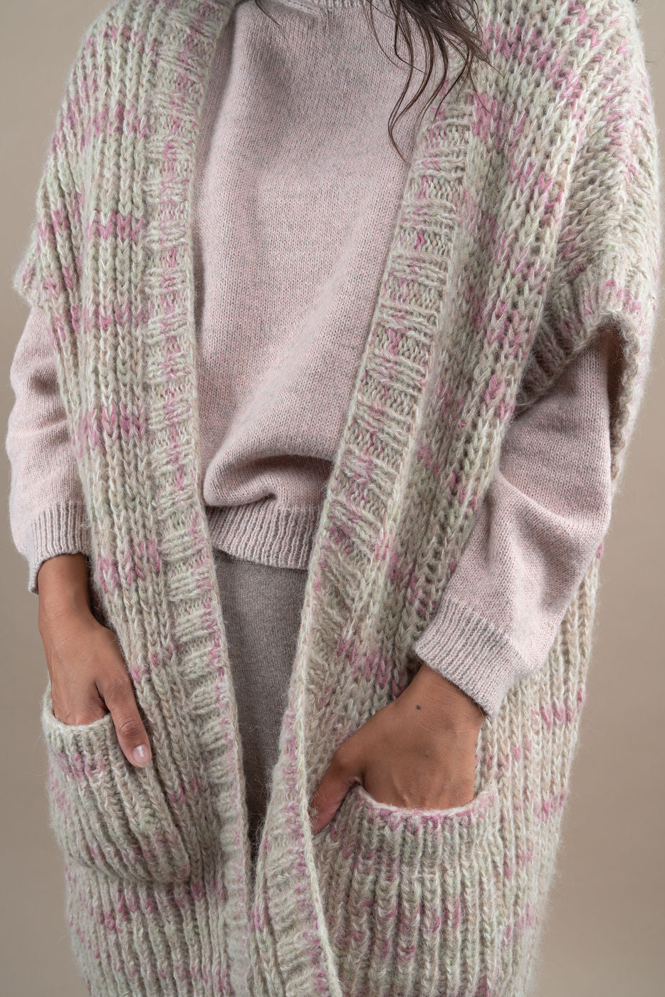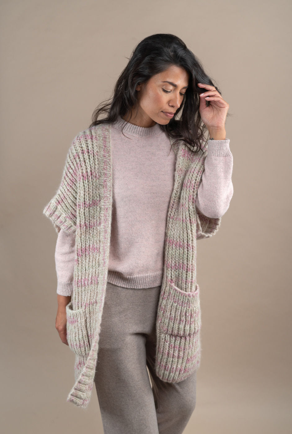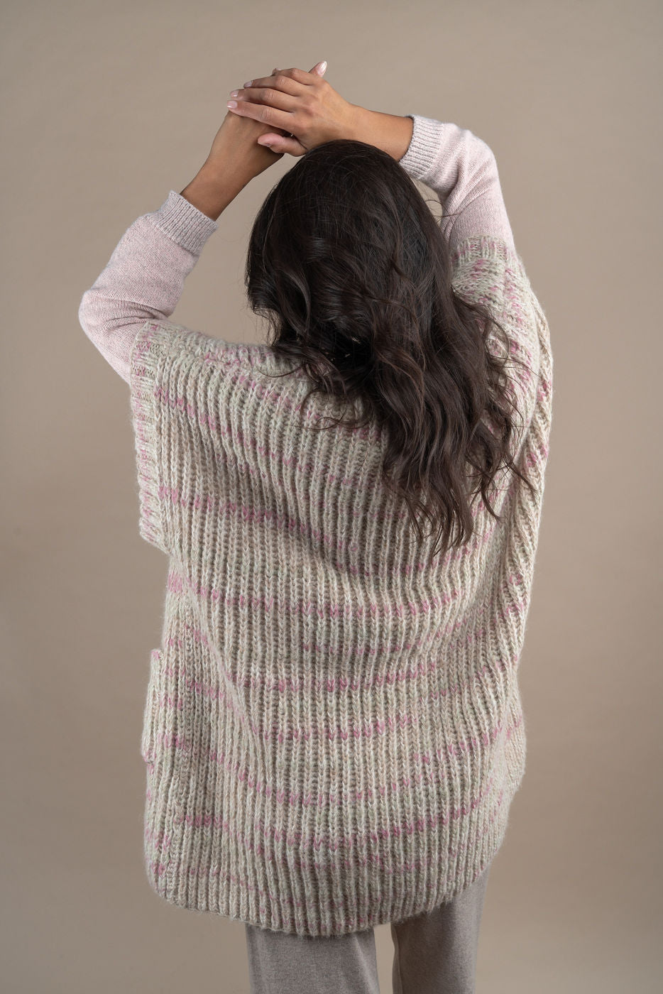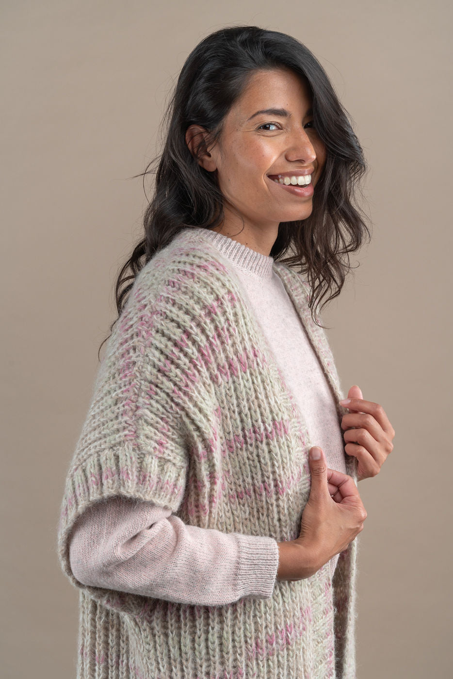 Met deze superzachte mouwloze cardigan in 100% baby alpaca kijk je uit naar koudere dagen. Het voelt heel aangenaam warm en zacht. Met de hand gebreid. Het model is 178 cm. One size.