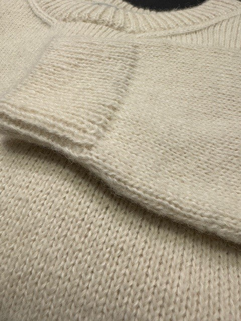 Amaryllis is een fijn pulletje met een ronde hals in 100% baby alpaca, het valt tot op de heupen en heeft een rib aan de manchetten en onderaan de pull. Deze pull werd met de hand gebreid in zacht warm wit.
