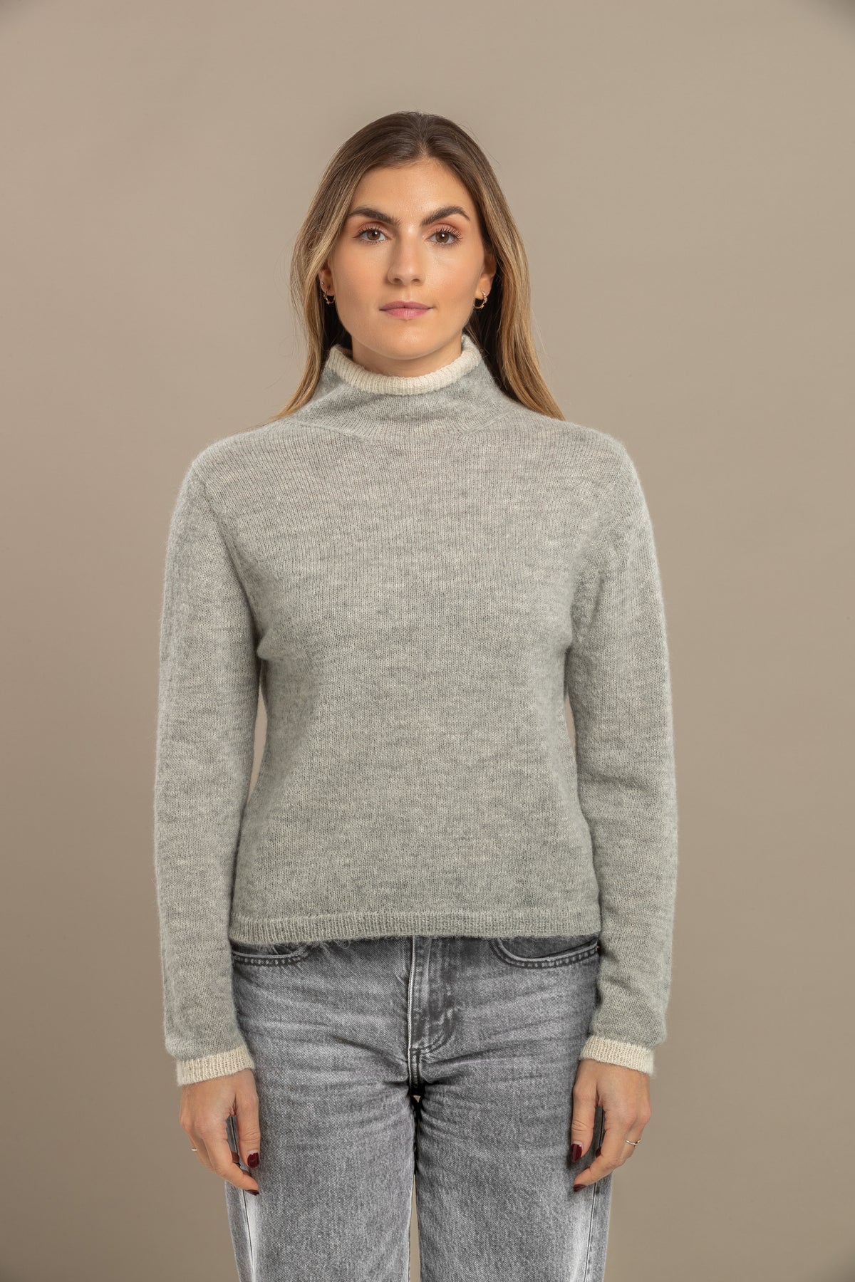 Dune is een zeer lichte trui met hoge hals. De zoom bij de hals en de mouwen is in een contrasterende kleur. 100% baby alpaca. Handgemaakt. Het model is 170 cm lang en draagt maat S. De maat valt normaal.